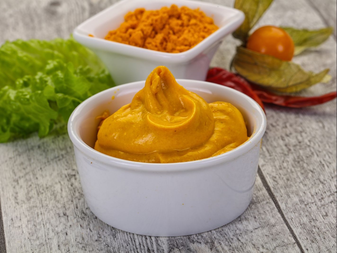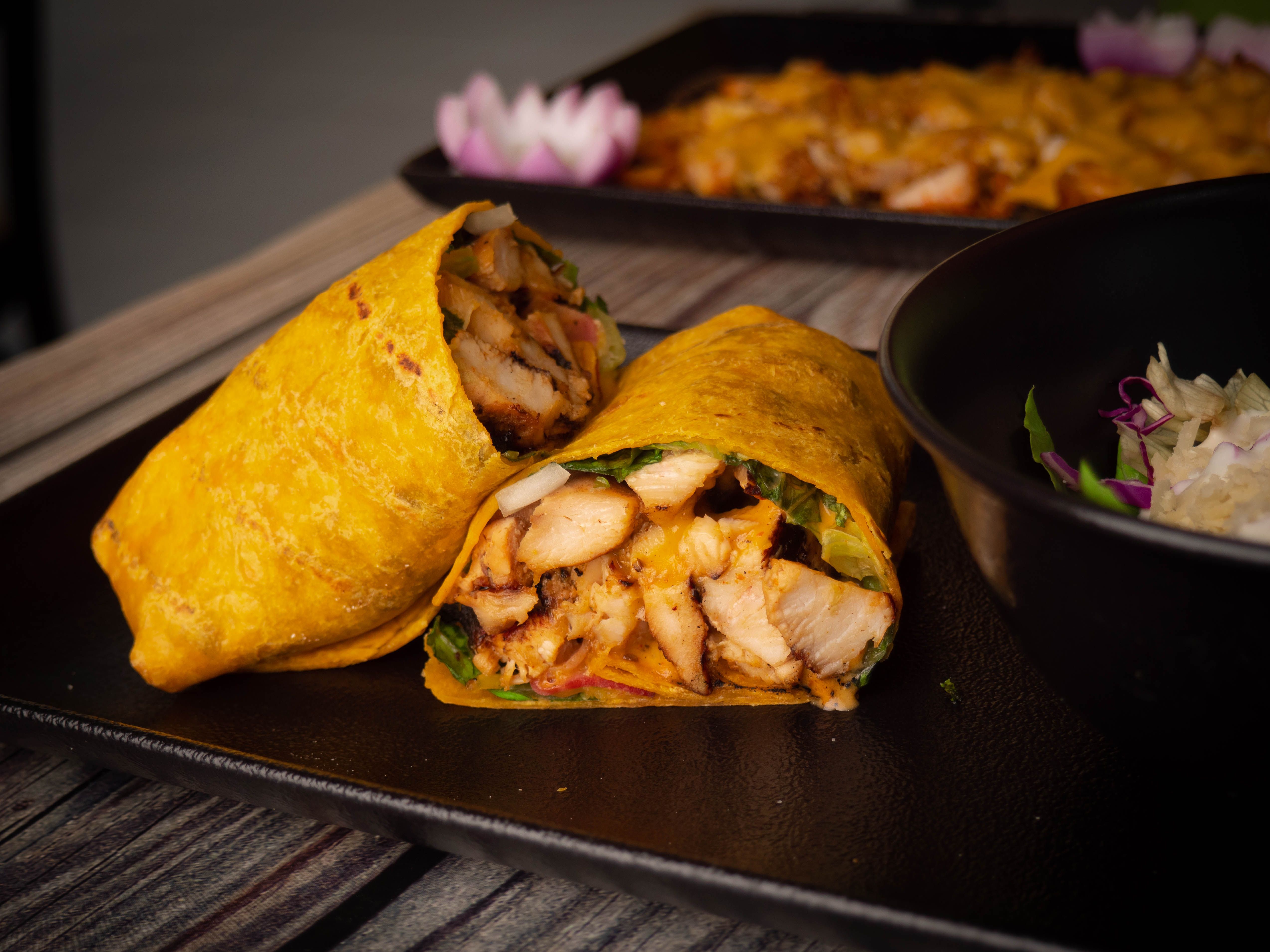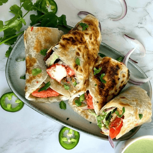 Rice & lentil crepe with chutney spread & chicken tikka sauce