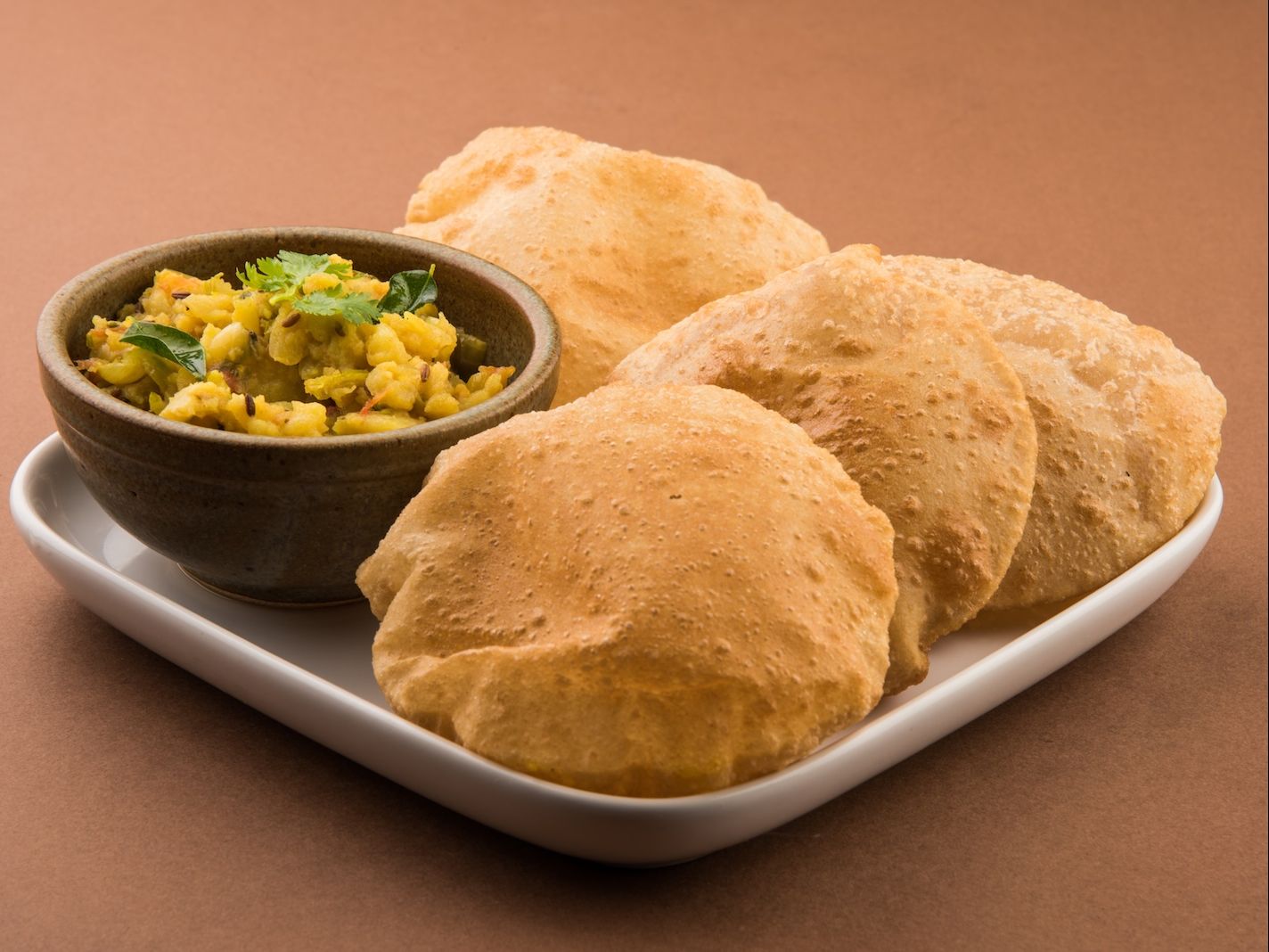 Oil fried wheat breads served with mashed potato masala