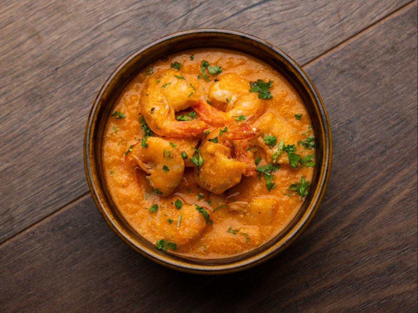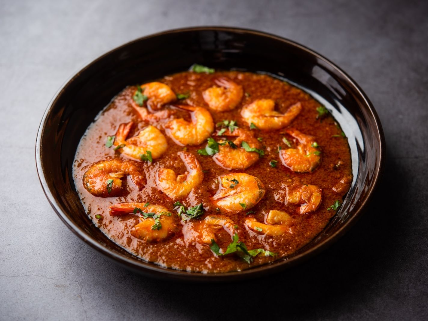 Marinated shrimp slow cooked in spices, served with rice