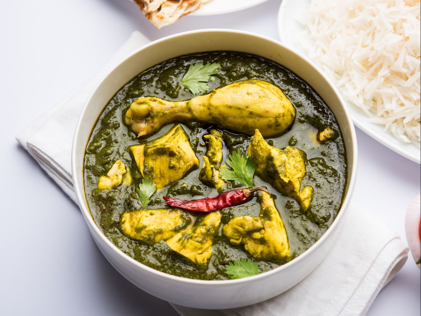 Chicken cubes cooked in spinach gravy. Served with white rice