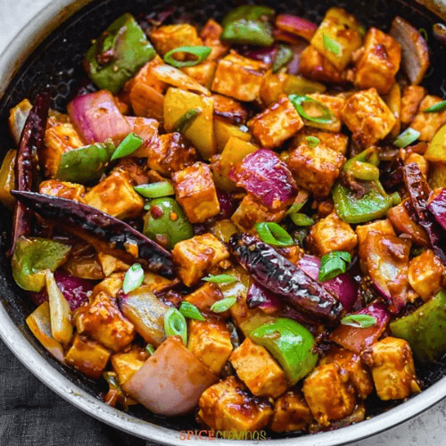 Fried cottage cheese with spicy chilli sauce