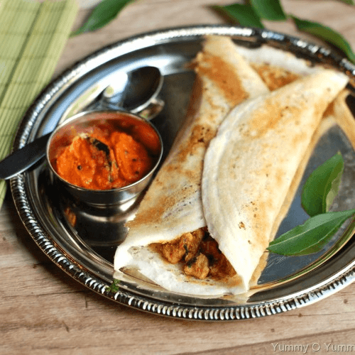 Chutney spread on thin rice & lentil crepe filled with cheese