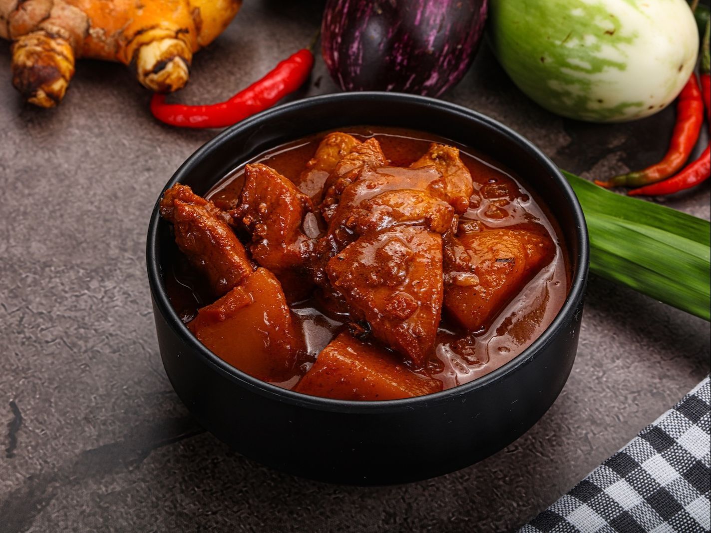 Chicken cooked in vinegar sauce with potatoes. Served with white rice